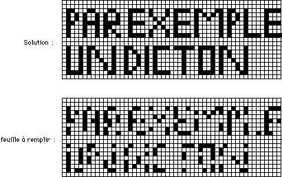 | Sur un quadrillage, on écrit une phrase avec des lettres composées d’un certain nombre de petits carrés (voir schéma). En un temps donné, les joueurs doivent deviner de quelles phrases il s’agit. On donne souvent un proverbe, ou une citation connue pour aider les participants. | ||||||