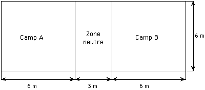 | On délimite un terrain comme indiqué dans le schéma. Chaque équipe se place dans un camp. Le chef de l’équipe désignée par le sort envoie le ballon dans le camp adverse de manière à ce qu’il soit difficile à recevoir. Le joueur qui parvient à le bloquer le remet à un coéquipier et passe dans le camp adverse où * il essayera de s’emparer du ballon pour l’envoyer dans sont propre camp. L’équipe gagnante est celle dont les joueurs sont tous passés dans le camp adverse.Règles plus précises :- Le ballon doit toujours être lancé de l’endroit où * il a été pris en mains, sauf s’il s’immobilise dans la zone neutre. Dans ce cas, c’est un joueur de l’équipe auquel le ballon était destiné qui va le chercher; il ne le relance qu’une fois rentré dans son camp.- Le joueur qui ramasse le ballon ou le saisit après un rebond reste dans son camp et le lance dans le camp adverse.- En cas de faute, le ballon est remis à un joueur de l’équipe adverse se trouvant, si possible dans le même camp que le joueur fautif.Un joueur commet une faute lorsque :Il frappe le ballon qui va être saisi par un adversaire; il lance le ballon en dehors de limites du terrain; il dribble ou se déplace avec le ballon; il lance le ballon dans la zone neutre ou y pénètre avant que le ballon n’y soit immobilisé.Les passes de ballon sont autorisées à condition que les joueurs soient distants d’au moins cinq pas. |