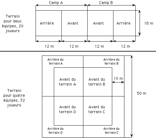 | On délimite une surface de 48 mètres sur 18, que l’on partage en deux parties égales. Puis on partage encore chacune de ces parties en deux. Les joueurs de chaque équipe se répartissent uniformément sur leurs zones avant et arrière. Le ballon est mis en jeu en le lançant en l’aire sur la ligne médiane. Les joueurs de chaque équipe doivent alors s’efforcer de la faire entrer dans leur propre zone arrière sans qu’elle touche terre, en se faisant des passes de joueur en joueur. Mais pour cela, ils n’ont le droit de la toucher ni avec les mains, ni avec les pieds, ni avec la tête. Ils utilisent uniquement les coudes, les épaules, les hanches, le dos et les genoux. L’équipe qui a réussi à faire entrer le ballon dans sa zone arrière marque 1 point. La partie se joue en 5 points.Pour simplifier le jeu, on peut autoriser le joueurs à toucher le ballon avec les mains, mais uniquement pour le faire rebondir.Variante : On peut former quatre équipes, et délimiter le terrain comme indiqué sur le schéma. |