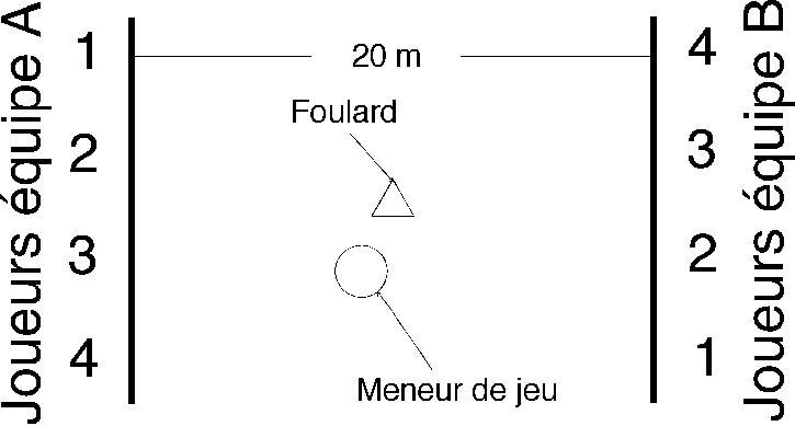 | Les joueur sont divisés en deux équipes de nombre égal. Deux lignes sont tracées sur le sol à une vingtaine de mètres l’une de l’autre. Un foulard est placé au centre, à égale distance des deux équipes.Les joueurs se placent face à face le long des deux lignes, de façon à occuper le coin opposé. Puis ils se numérotent (voir schéma). Le meneur de jeu, placé près du centre, appelle un numéro. Les deux joueurs portant ce numéro s’efforcent d’attraper le foulard et de le ramener derrière leur ligne. Si un joueur y parvient, l’équipe marque deux points.A partir du moment où * un joueur a touché le foulard, il devient vulnérable, c’est à dire que s’il est touché par son adversaire avant d’avoir rejoint son camp, l’équipe adverse marque 1 point, et son équipe 0.Généralement, les deux joueurs s’observent et essaient de tromper l’adversaire par des feintes, afin de s’emparer du foulard.Si au bout d’une ou deux minutes, aucun n’a saisi le mouchoir, le meneur de jeu appelle un autre numéro en renfort. Dans ce cas, les joueurs ne peuvent toucher que le joueur adverse portant le même numéro que lui.L’équipe gagnante est celle qui totalise la première un nombre de points déterminés. |