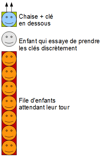 | Pour ce jeu, il faut placer une chaise de dos (avec les clés dessous) devant une file d'enfants. Les enfants passent tour à tour sur la chaise et reste attentif aux bruit. >> Les enfants présents derrière la chaise doivent récupérer les clés et taper sur l'épaule de la personne assise. Si le joueur assis entend du bruit, il se retourne et crie "retourne à ta place". Le jeu continue en changeant à chaque fois que l'épaule a été touchée. Ce jeu a été ajouté par un(e) internaute: Wence | ||||||