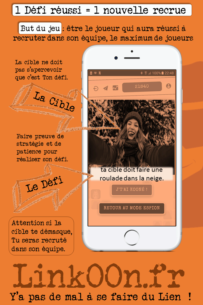 | But du jeu : recruter tous les autres joueurs dans son équipe. 1 défi réussi = 1 nouvelle recrue ! La cible ne doit pas se rendre compte qu'il s'agit d'un défi, sinon c'est elle qui vous recrute dans son équipe. Lien pour organiser la partie: https://drive.google.com/drive/folders/1khwAKo4499iJ-SsUcIoZS69M8h_arEpH?usp=sharing Linkoon est la version 2.0 du jeu du Killer : - COLLABORATIF : plus d'élimination, à la place on recrute. Chaque joueur participe ainsi jusqu'à la fin de la partie. - NUMÉRIQUE : dites ADIEU aux petits bouts de papier, chaque joueur s'identifie par photo ... via son smartphone. - GAIN DE TEMPS : en 2 minutes, créez une partie jusqu'à 110 joueurs ! - PERSONNALISATION... des défis par mots-clefs : Famille, amis /potes, collègues, au boulot, à l'école, à la maison, fête de famille, mariage, noël ... La gestion des joueurs ? Des défis ? Et de la partie ? LinkOON s'occupe de tout. L'organisateur peut jouer... serein. Ce jeu a été ajouté par un(e) internaute: Céline |